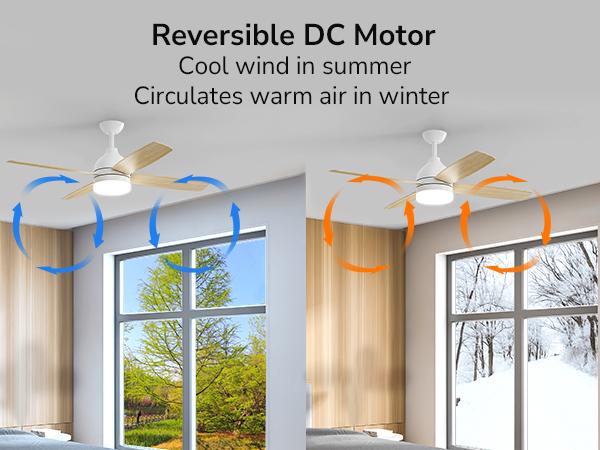 POWERFUL SUMMER/WINTER FAN: Designed for spacious areas, the blades move a TON of air, ensuring a comfortable and even temperature throughout the area. The energy-efficient DC motor delivers up to 8500 CFM airflow and is reversible for both summer and winter use. It's ideal for living rooms, large bedrooms, offices, and covered outdoor spaces like decks, porches, and balconies.