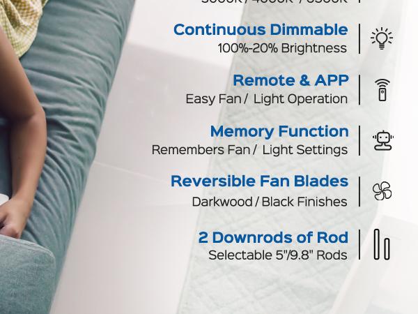 3-COLOR DIMMABLE LIGHT: This is not just a fan, but also a versatile ceiling light. The 2000lm super bright LED light offers 3 color temperature options of 3000K warm white, 4000K neutral white, and 6500K cool white. Each color is dimmable from 100% to 20%, allowing you to adjust the lighting to your preference. The memory function remembers your last light setting before it was turned off.